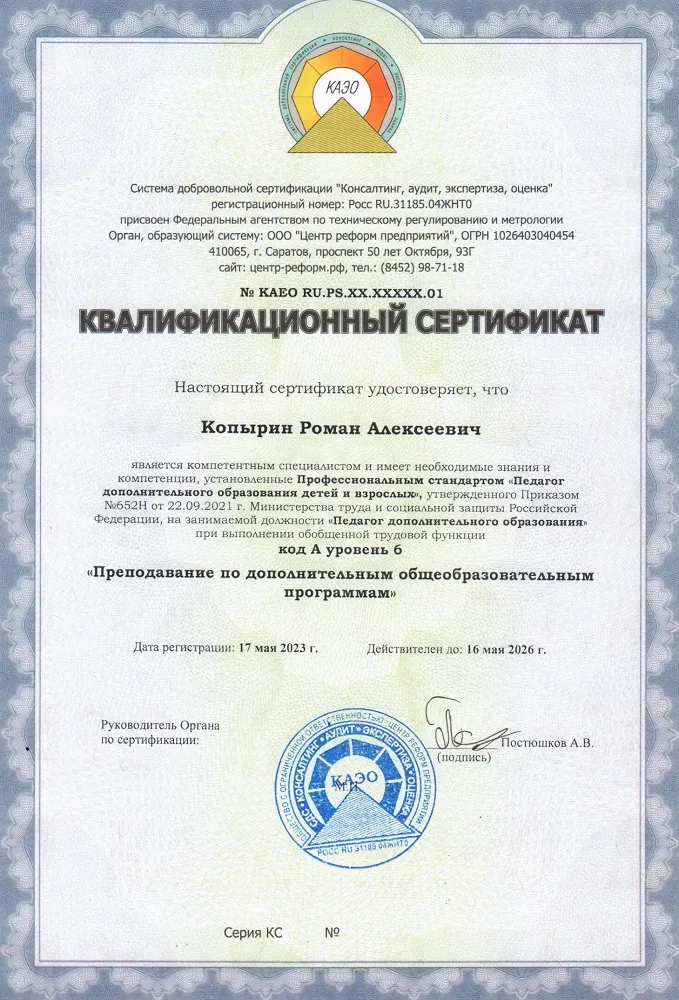 Диплом о профессиональной переподготовке установленного образца и квалификационный сертификат соответствия Профессиональным стандартам.